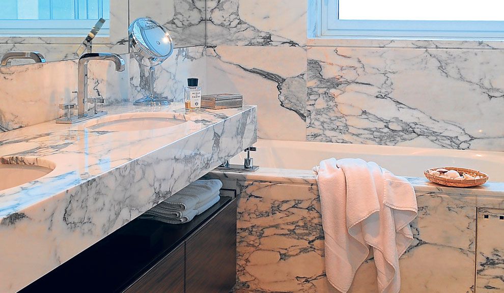 Para los baños se utilizó mármol travertino, salvo en el principal que está revestido en mármol arabescato tanto en la parte de bacha y bañera como en el compartimiento para la ducha y la parte del toilette. Cuando uno parte lejos de su tierra natal muchas veces no es fácil sentirse en casa, pero sin dudas Florencia (más allá de lo profesional) hizo que las dueñas se planteen quedarse más tiempo en nuestra ciudad.